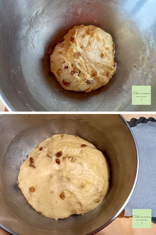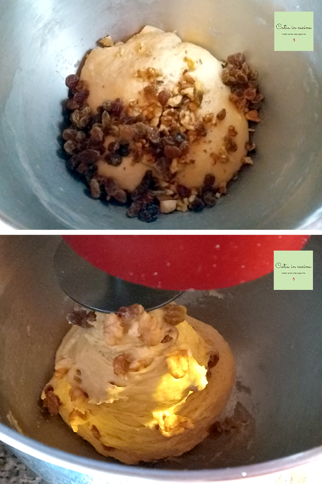 Impastare fino ad ottenere un composto uniforme e incordato, quindi lasciarlo riposare per un’ora circa, dopodiché aggiungere l’uvetta e le noci a pezzetti.