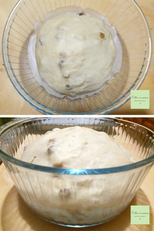 Mettere l’impasto (comunque sempre pirlato) sul fondo di uno stampo dai bordi alti – io ho usato uno stampo da sufflè in vetro che ho coperto sul fondo con un pezzetto di carta forno – e lasciarlo lievitare fino al raddoppio (in questo caso ha impiegato 3 ore e un quarto), sempre dentro al forno spento e possibilemente con la luce accesa.