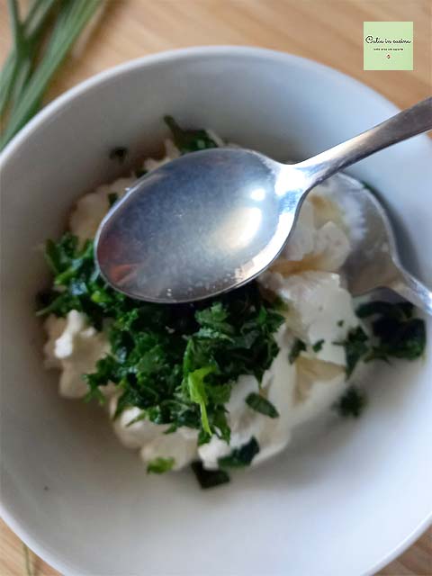 Alla fine ho fatto un po’ di testa mia, seppur cercando di rimanere fedele alla versione base, fatta di panna acida, aglio e prezzemolo. Ho solo aggiunto un paio di erbe aromatiche in più.