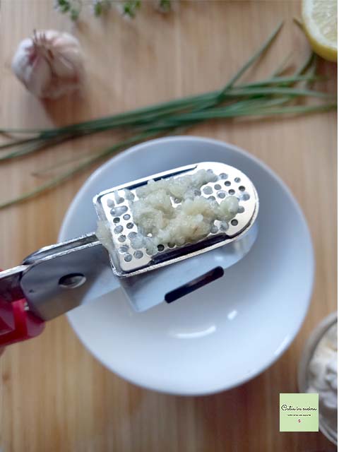 🔹 In mancanza dello spremiaglio si può preparare la salsa con un piccolo robot da cucina o tritatutto. In questo caso si può usare meno aglio (con lo spremiaglio la parte fibrosa dell’aglio viene scartata, mentre nel tritatutto lo spicchio viene utilizzato tutto).