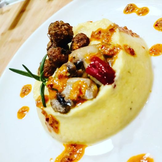 Un secondo alternativo, uno sformato di cavolfiore giallo con funghi, polpettine di chianina accompagnato con salsa di 'nduja.