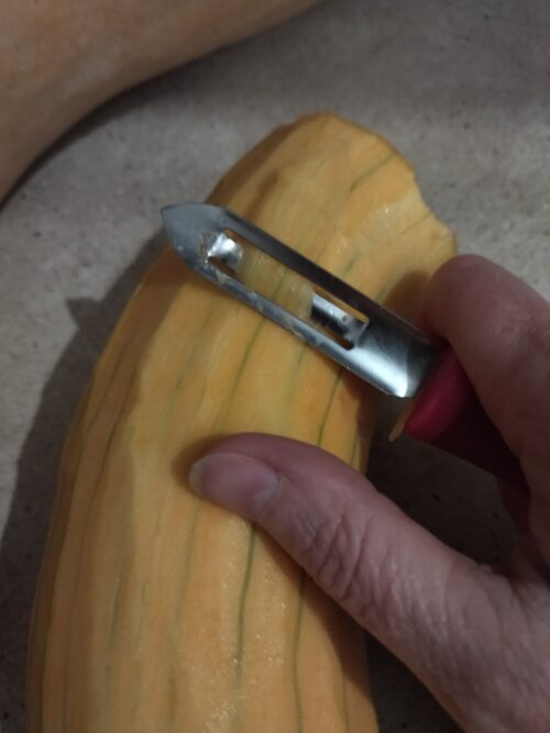 Pulite la zucca, pelatela (io di solito uso un pelapatate), tagliatela a dadini.