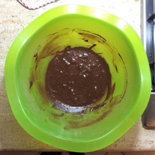 A questo punto versate nella ciotola anche il cioccolato fuso e continuate a mescolare. Unite infine poco alla volta farina, cacao e vanillina setacciati assieme.
