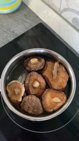 In primo luogo porta quasi a bollore 2 bicchieri d’acqua circa all’interno di un pentolino, dopodiché spegni la fiamma e immergi al suo interno i funghi shiitake secchi per almeno 15 minuti