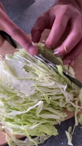 Nel frattempo procedi tagliando mezzo cavolo cappuccio molto finemente in modo da ottenere delle listarelle sottili. Per questo aiutati con un coltello a lama liscia ben affilato