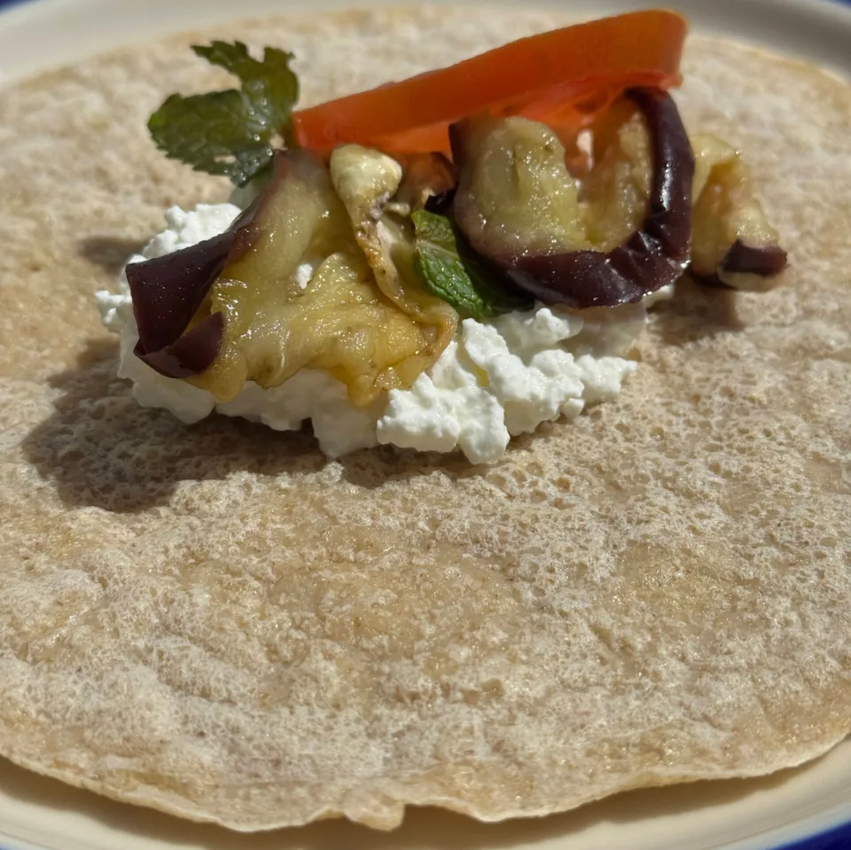 Per terminare, guarnisci le tue piadine con gli ingredienti che più preferisci. Per rimanere salutari, in questo esempio, ho utilizzato fiocchi di latte, pomodoro e melanzana al forno!