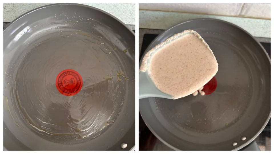 A questo punto scalda una padella antiaderente unta con dell’olio e versa all’interno un mestolo di composto avendo cura di coprire tutte la superficie di cottura. Lascia cuocere per qualche minuto e non appena la piadina si sarà solidificata procedi girandola.