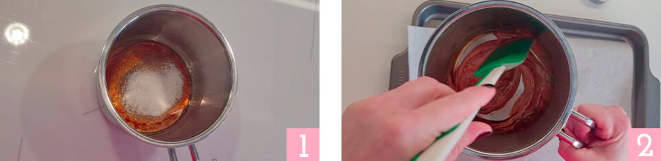 Mettete lo zucchero in una padella antiaderente e fatelo sciogliere a fiamma medio/bassa [1]. Una volta liquido, togliete dal fuoco, e unite un pizzico di bicarbonato [2].