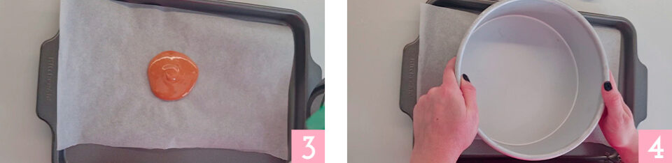 Mescolate bene e una volta ottenuto un colore ambrato, versate il tutto su un foglio di carta forno [3]. Attendete circa 10 secondi e appiattitelo con una teglia da forno o una pentola [4].