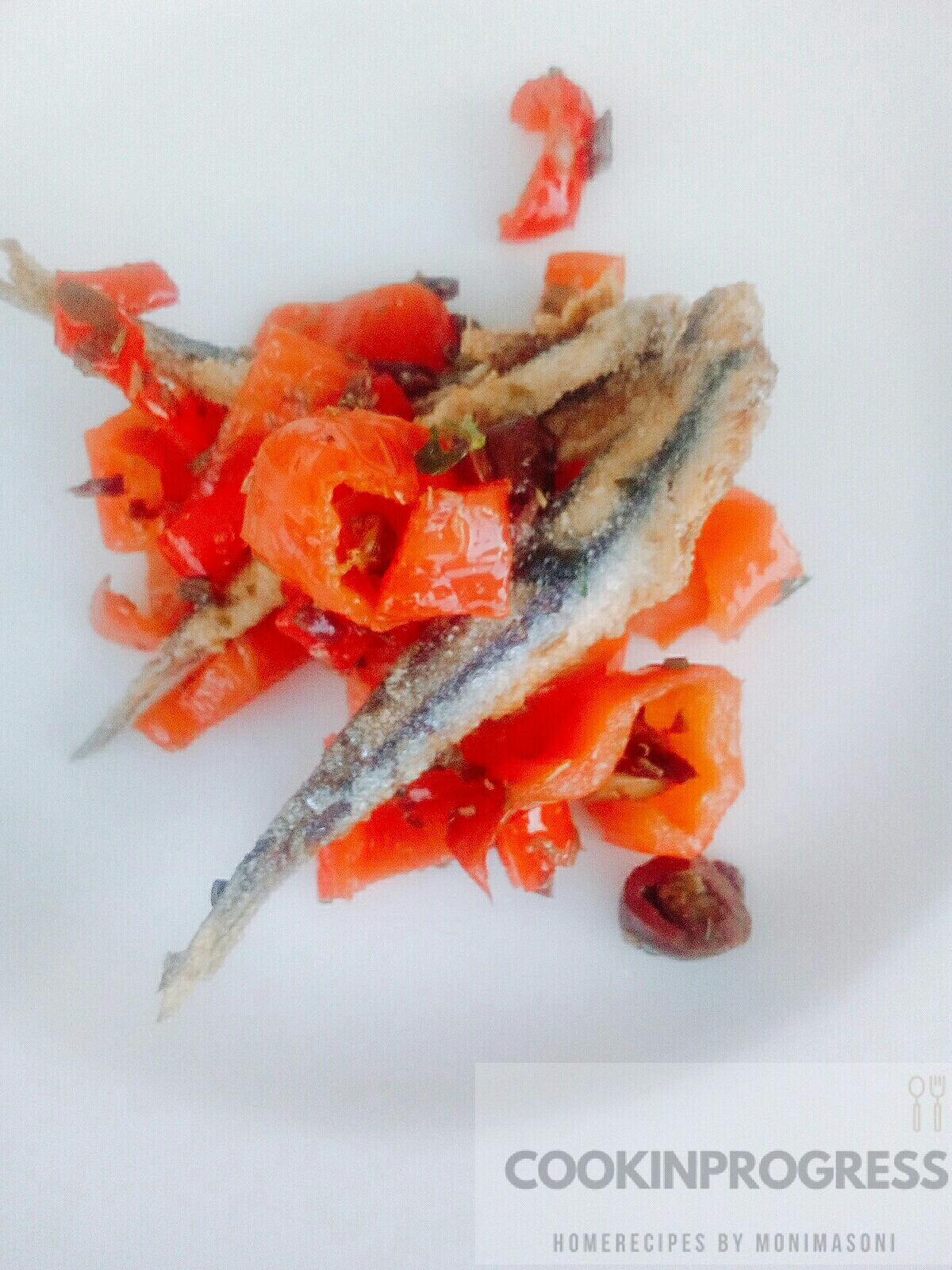 Nel frattempo in un’altra padella far scaldare l’olio di arachide, pulire le acciughe togliendo loro la testa e le viscere ma lasciando la spina. Sciacquare bene, asciugare con carta e infarinare con semola di grano duro. Friggerle a fuoco vivace ma non troppo alto. Scolarle con un mestolo forato ed unirle nel tegame con i peperoni. Lasciare insporire aggiustando di sale.