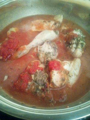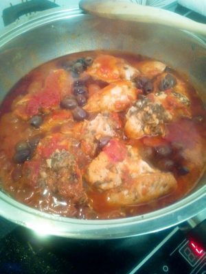 Il pollo alla cacciatora è un secondo piatto tipico del Centro Italia, soprattutto della cucina toscana, marchigiana e umbra, di umili origini. Per quanto non siano chiare le origini del nome “alla cacciatora”, è molto probabile che in passato i contadini preparassero il pollo, un animale sempre presente nei loro cortili, con le verdure dell’orto e tramite la tecnica dello stufato, facendolo cuocere a lungo, com’era d’abitudine nei decenni scorsi. Ne esistono più di una versione, la mia è rossa e con olive leccine o taggiasche. Il segreto è nella pazienza…per cucinare piatti come questo non bisogna aver fretta…