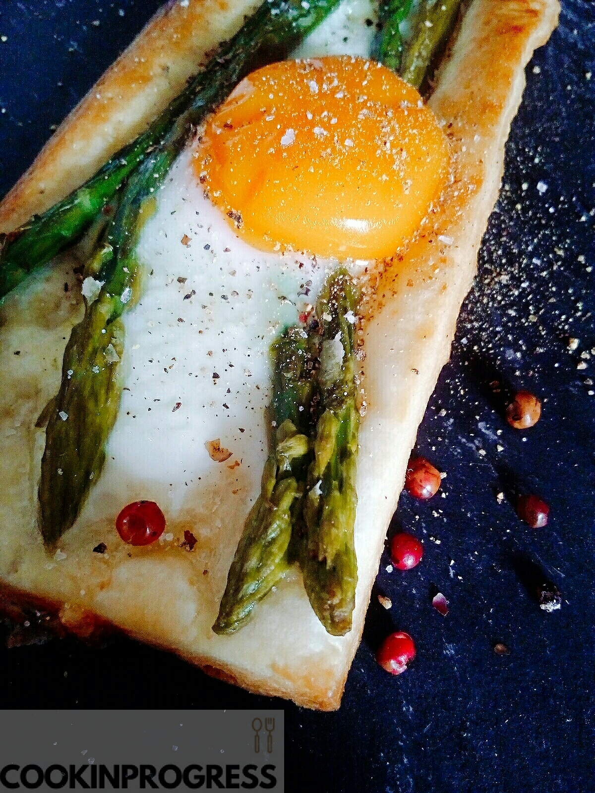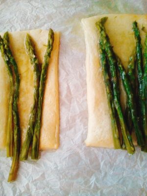 A questo punto sistemate sulla sfoglia 4 asparagi lasciano dello spazio tra loro. Sgusciate l’uovo, l’albume versatelo sugli asparagi e tenete da parte il tuorlo integro. Rimettete in forno per 6-7 minuti in modo che l’albume si rapprenda.