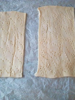 Preparate la sfoglia: Ricavare dal foglio di pasta sfoglia un rettangolo di 10x12cm, sistemarlo su una placca foderata di carta da forno bagnata e strizzata. Spennellate il rettangolo con il latte e punzecchiatelo con i rebbi della forchetta.