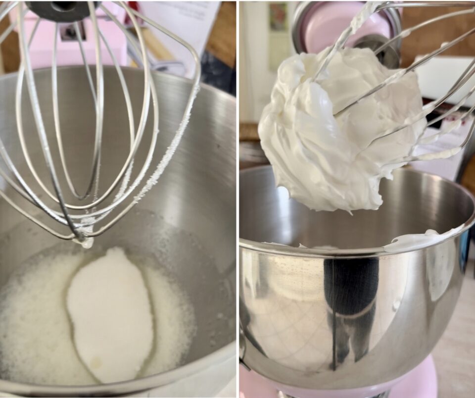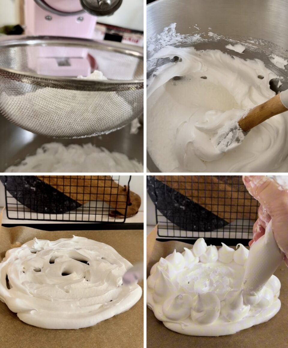 Aggiungi lo Zucchero a Velo: Quando gli albumi sono a neve ferma, aggiungi lo zucchero a velo vanigliato setacciandolo un po’ alla volta. Incorpora lo zucchero a velo dall’alto verso il basso finché il composto non è bianco, lucido e molto sodo (meringa a neve ferma). Se provi a toccarla, non devi sentire granelli di zucchero.