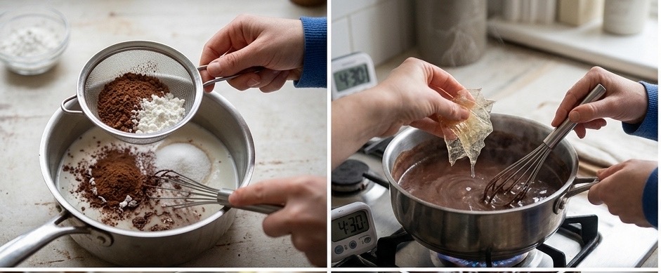 Versa il latte freddo direttamente nel pentolino. Aggiungi l’amido di mais e il cacao amaro setacciati (setacciarli è importante per evitare i grumi). Unisci lo zucchero se lo usi. Mescola energicamente con una frusta fino a ottenere un composto omogeneo, senza tracce di polvere. Porta il pentolino sul fuoco a fiamma media. Continua a mescolare senza mai fermarti, aggiungi i fogli di gelatina inumidita e ben strizzata. Continua a mescolare con movimenti circolari che arrivino anche ai bordi e al fondo. In 5–7 minuti vedrai il composto addensarsi progressivamente fino a diventare una crema densa e lucida. Quando la frusta lascia il segno, è pronta.