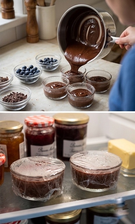Togli dal fuoco e versa subito la crema in coppette monoporzione o in uno stampo unico. Lascia raffreddare a temperatura ambiente per 10 minuti, poi copri con pellicola a contatto (per evitare la crosticina) e trasferisci in frigorifero. Aspetta almeno 3–4 ore, meglio tutta la notte.