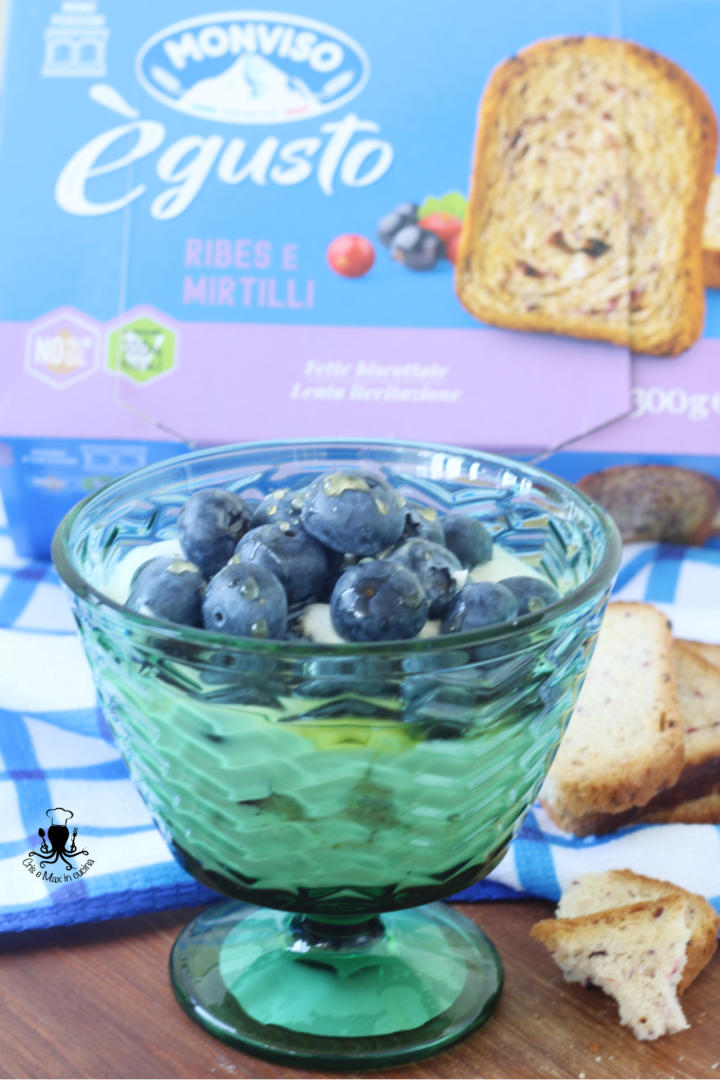 Questa versione è realizzata con yogurt greco, miele e scorza di limone, per una crema profumata e vellutata, arricchita da frutta fresca e da un tocco croccante irresistibile. Per dare struttura e gusto alla coppa ho utilizzato le fette biscottate Monviso al ribes e mirtilli, presenti nella Degustabox di aprile 2026: fragranti, leggermente dolci e perfette per creare un piacevole contrasto con la morbidezza dello yogurt.