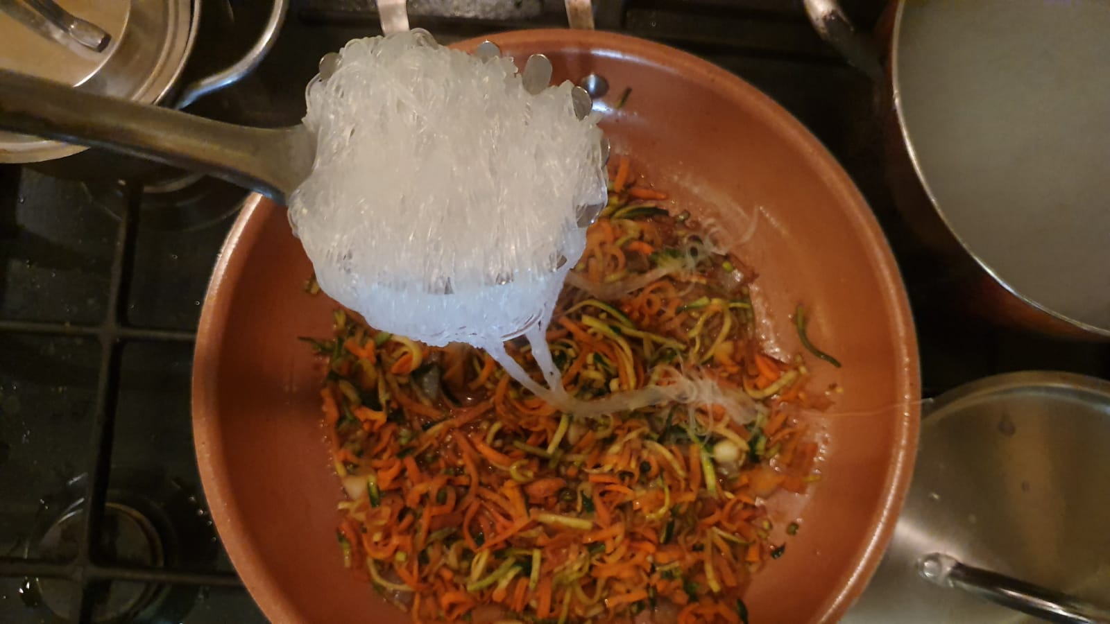 A doratura ultimata, se volete dare una scottata alle verdure, calatele in padella e versate un giro o due di salsa di soia. Zucchine e carote, anche crude, sono perfette con gli spaghetti cinesi.