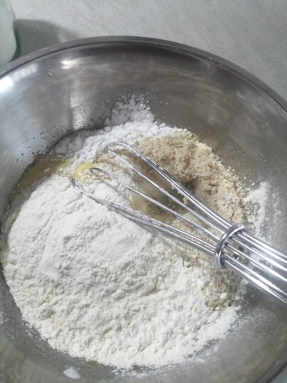 Mischio tutto insieme unendo anche la farina, l’olio e lavoro il tutto per circa 2 minuti con la frusta a mano, ma potete anche usare quella elettrica se vi viene più comodo.