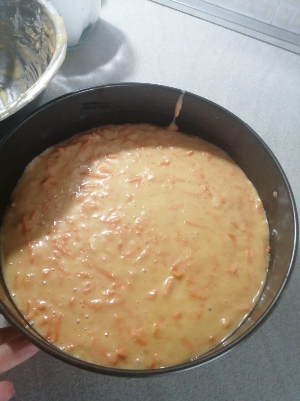 Ora prendo le carote, le pelo con il pelapatate, taglio le due estremità e poi le passo nella grattugia dai fori grandi. Unisco le carote grattugiate al mio impasto e amalgamo il tutto con un cucchiaio.