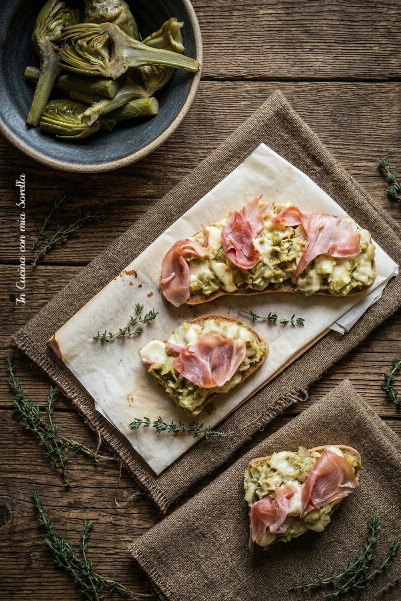 Estrarre e servire su un tagliere i Crostini con carciofi e prosciutto, aggiungendo altro timo a piacere.