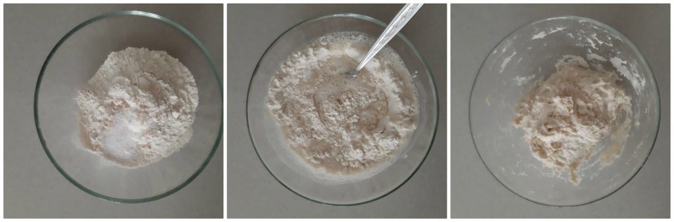 Cominciate ad unire l’acqua tiepida, e mescolate con il cucchiaio per impastare gli ingredienti. Quando il composto comincerà a legarsi, unite una parte di olio, e il cucchiaino abbondante di sale.