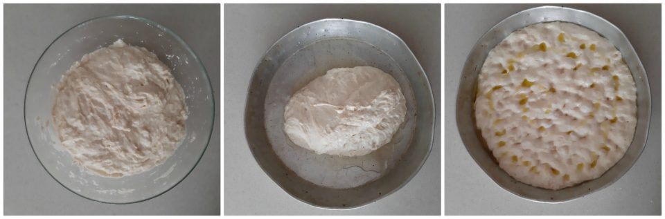 Trascorso il tempo di lievitazione, prendete la teglia dove andrete a cuocere la focaccia, ungetela con abbondante olio, e versate all’interno l’impasto.
