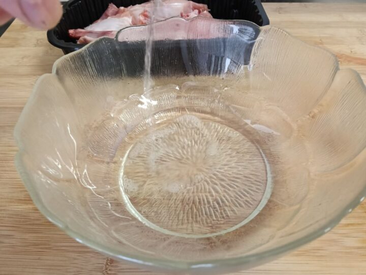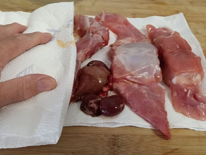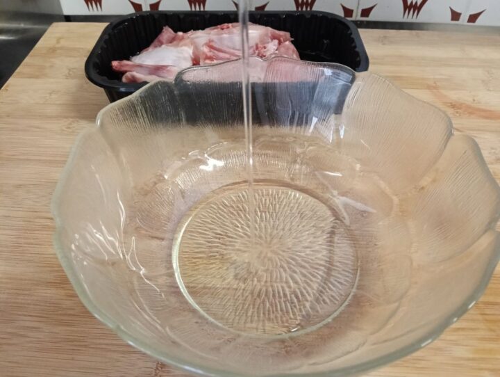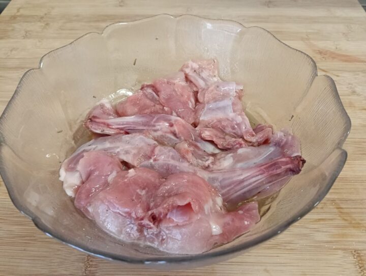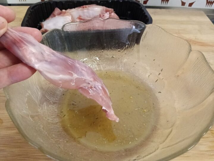 Asciughiamo per bene il coniglio con della carta da cucina, in una insalatiera uncominciamo a mettere l’olio e il vino bianco.