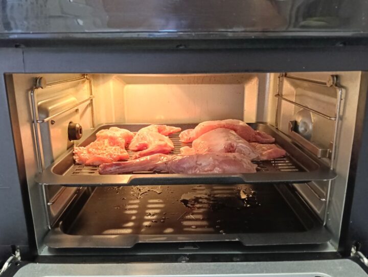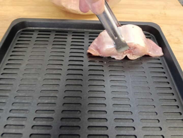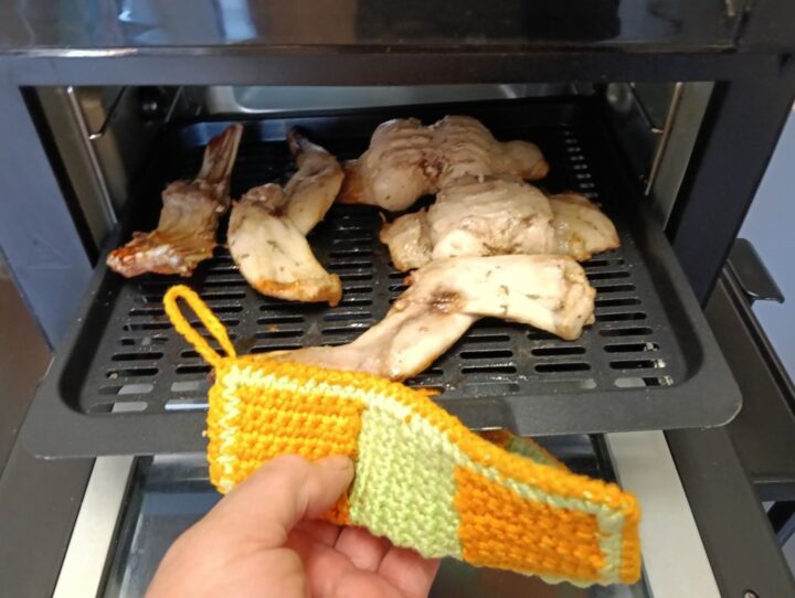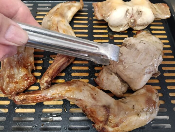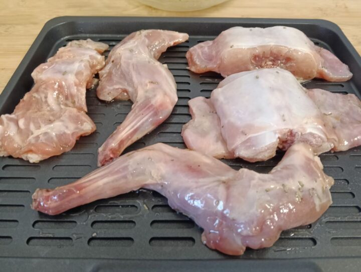 Passato il termine per la marinatura incominciamo a posizionare il coniglio sulla teglia forata della friggitrice e posizioniamola al suo interno.