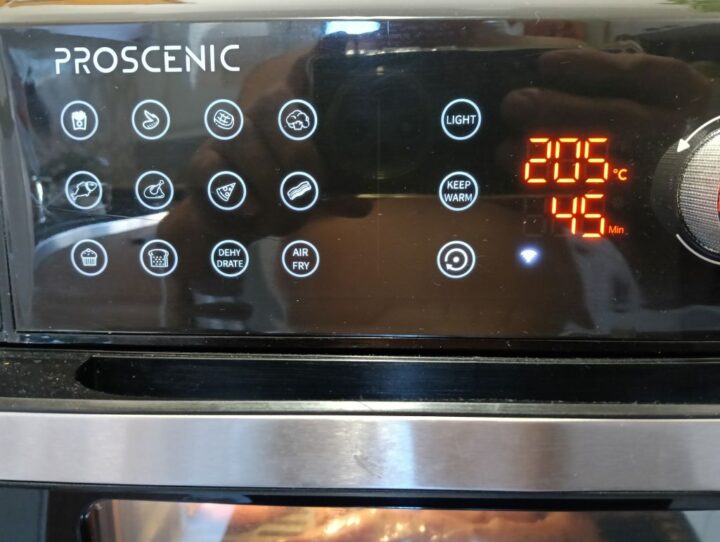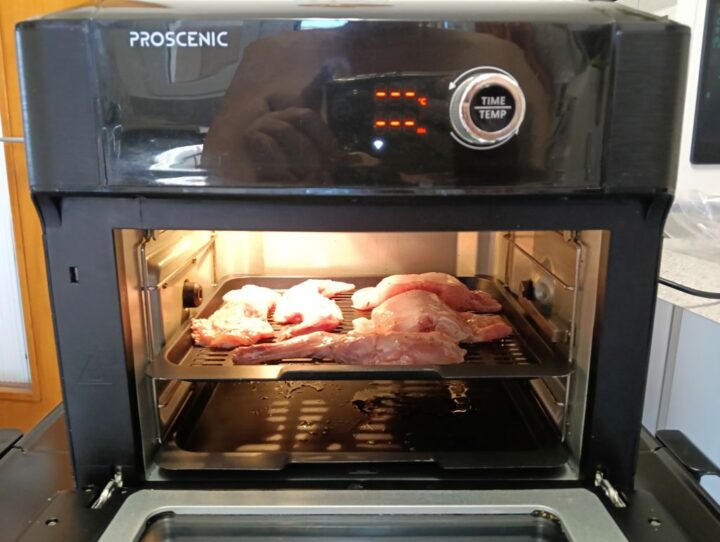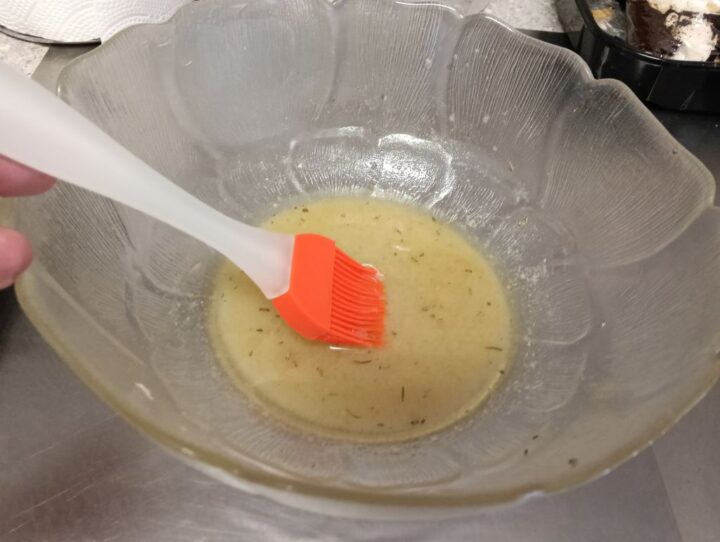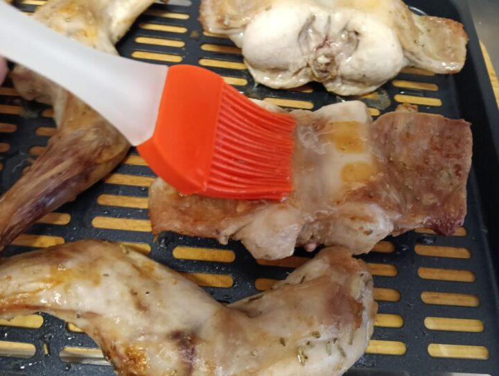 una volta messa all’interno della friggitrice diamo i gradi e il tempo di cottura e ogni tanto spennelliamo il coniglio con il liquido della marinatura.