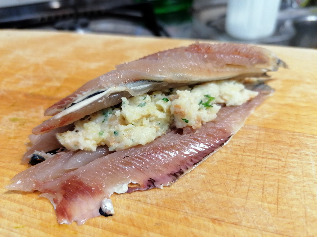 Dopo averlo strizzato e tritato aggiungiamo tutti gli altri ingredienti ( per il ripieno ) e amalgamiamo per bene. dopo aver pulito le sardine le apriamo e le stendiamo sul tagliere, aiutandoci con una forchetta prendiamo una giusta quantità di ripieno e posizioniamolo al centro della sardina, quindi prendiamo un’altra sardina aperta e copriamo il ripieno.