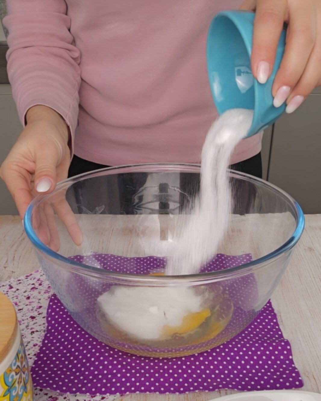 In una terrina capiente unite le uova con lo zucchero, mescolando con le fruste.