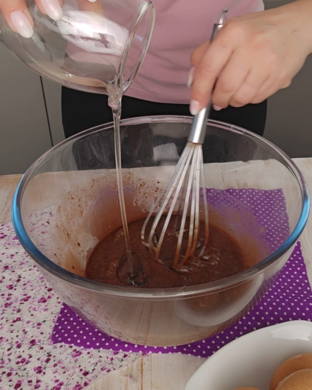 Aggiungete la crema pan di stelle e mescolate ancora con le fruste elettriche. Di seguito versate l’olio e il latte.