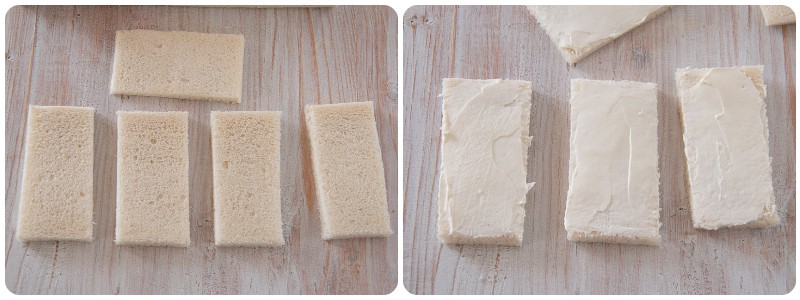 Tagliate il pane a fette lunghe circa 10 cm e larghe 5 cm potete creare anche altre forme se preferite. Tostate il pane, dopodiché spalmare su ogni fetta in formaggio.