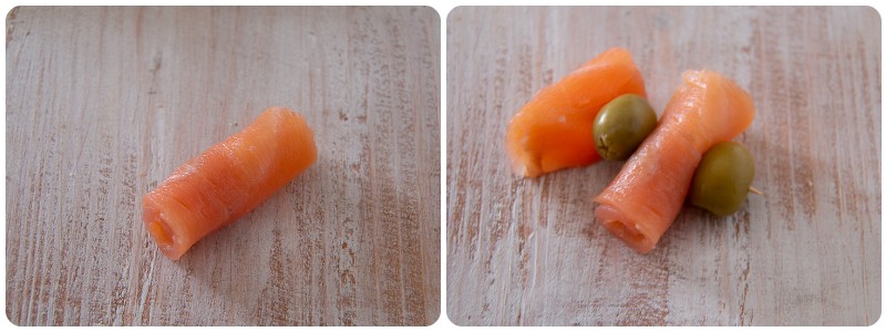 Quindi guarnite le tartine aiutandovi con un stecchino, con una fettina di salmone arrotolata e un’oliva, alternando gli ingredienti.