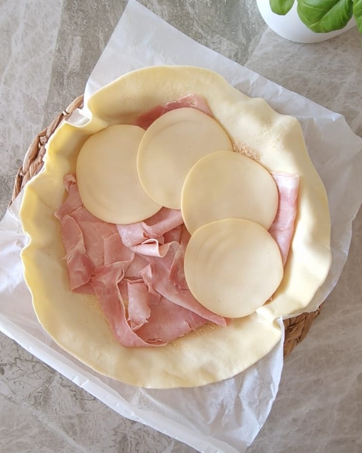 Farcitela con il prosciutto cotto per primo e le fette di formaggio sopra; dopodiché rivoltate i lembi della torta formando un cordoncino.