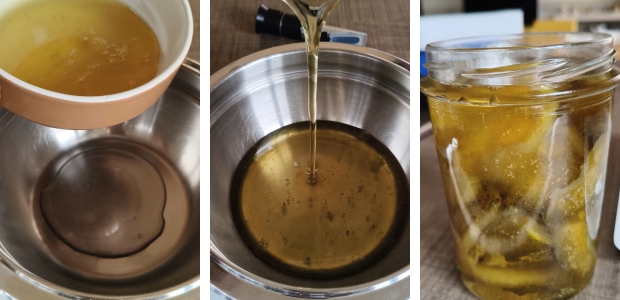 La canditura avviene quando lo sciroppo misura 70° Brix oppure se non avete lo strumento, quando le scorze diventano quasi traslucide in controluce e sullo sciroppo si forma una sorta di “velo” simile a quello del tè caldo.