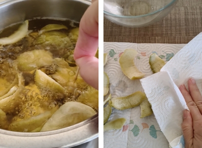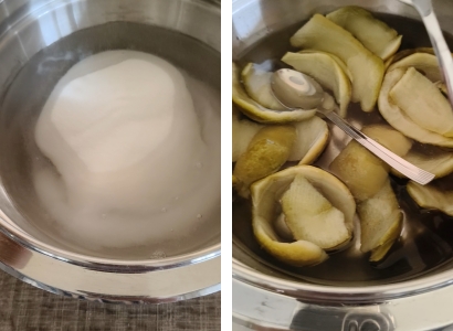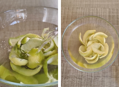 Far bollire dell’acqua pulita e lasciar bollire le scorze fino a quando, infilando uno stuzzicadenti, la consistenza sarà morbida.