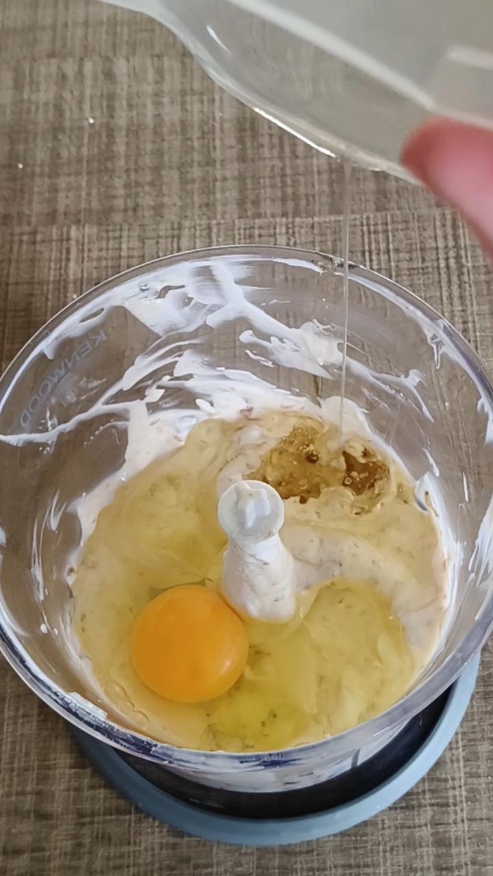 Versare nel bicchiere del tritatutto lo yogurt e i datteri e ridurre in crema. Aggiungere poi l’uovo e l’olio ed emulsionare a impulsi per pochi secondi.