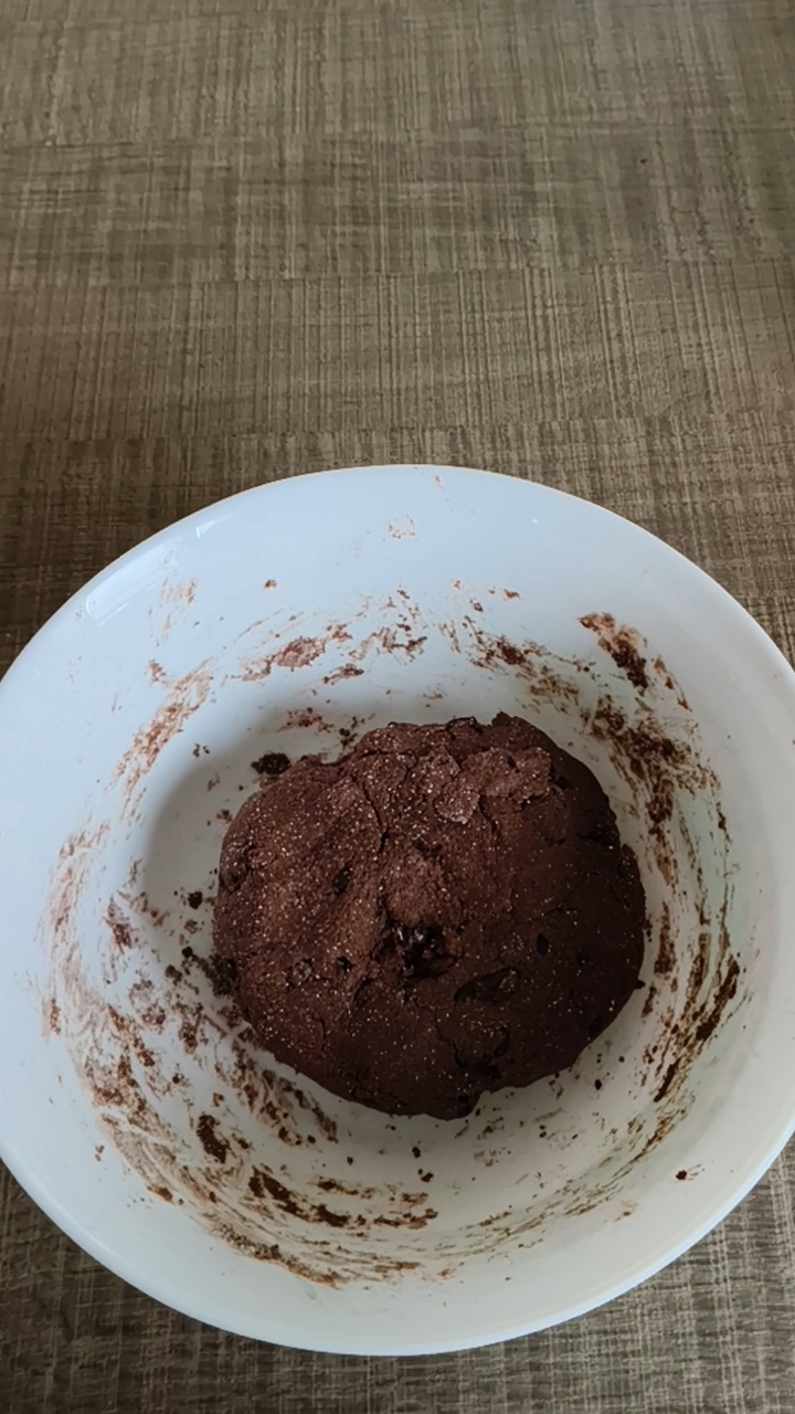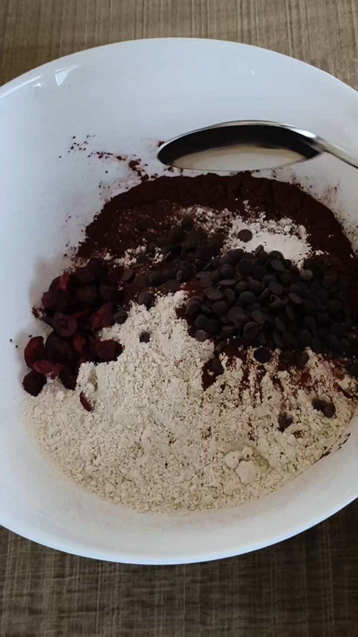 In una ciotola versare la farina integrale, e il cacao, il lievito e le gocce di cioccolato; mescolare velocemente per amalgamare,
