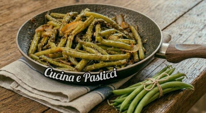 Per questa ricetta, l’ideale è sbollentare i fagiolini in acqua salata per soli 5-6 minuti. Devono restare molto rigidi. Scolali e asciugali perfettamente con un canovaccio (se sono umidi non “abbrustoliranno” bene in padella).