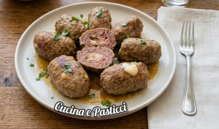 Togli il coperchio negli ultimi due minuti per far restringere il sughetto finché non diventa cremoso. Servi i mini polpettoni caldi, tagliandone uno a metà per mostrare il cuore filante e il rosa del prosciutto, nappandoli generosamente con il loro fondo di cottura.