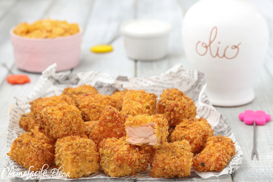 I bocconcini di salmone fresco al forno sono una ricetta di pesce super veloce e buonissima. Avevo comprato dei filetti di salmone senza pelle e ho pensato di cucinarli così, li ho passati nelle uova insaporite con delle spezie e poi nei corn fakes tritati. Ho risolto la cena! Ho servito i bocconcini di salmone con una salsa allo yogurt ed un contorno di insalata e sono andati letteralmente a ruba, sono teneri dentro e super croccanti fuori, la panatura di corflakes li rende dorati e crunchy anche se non sono fritti, sono leggeri e sfiziosi, fatti così piaceranno tantissimo anche ai più piccini, a mia figlia sono piaciuti un sacco! Inoltre, sono perfetti anche come antipasto, per un aperitivo o un buffet, sono sfiziosissimi 😀