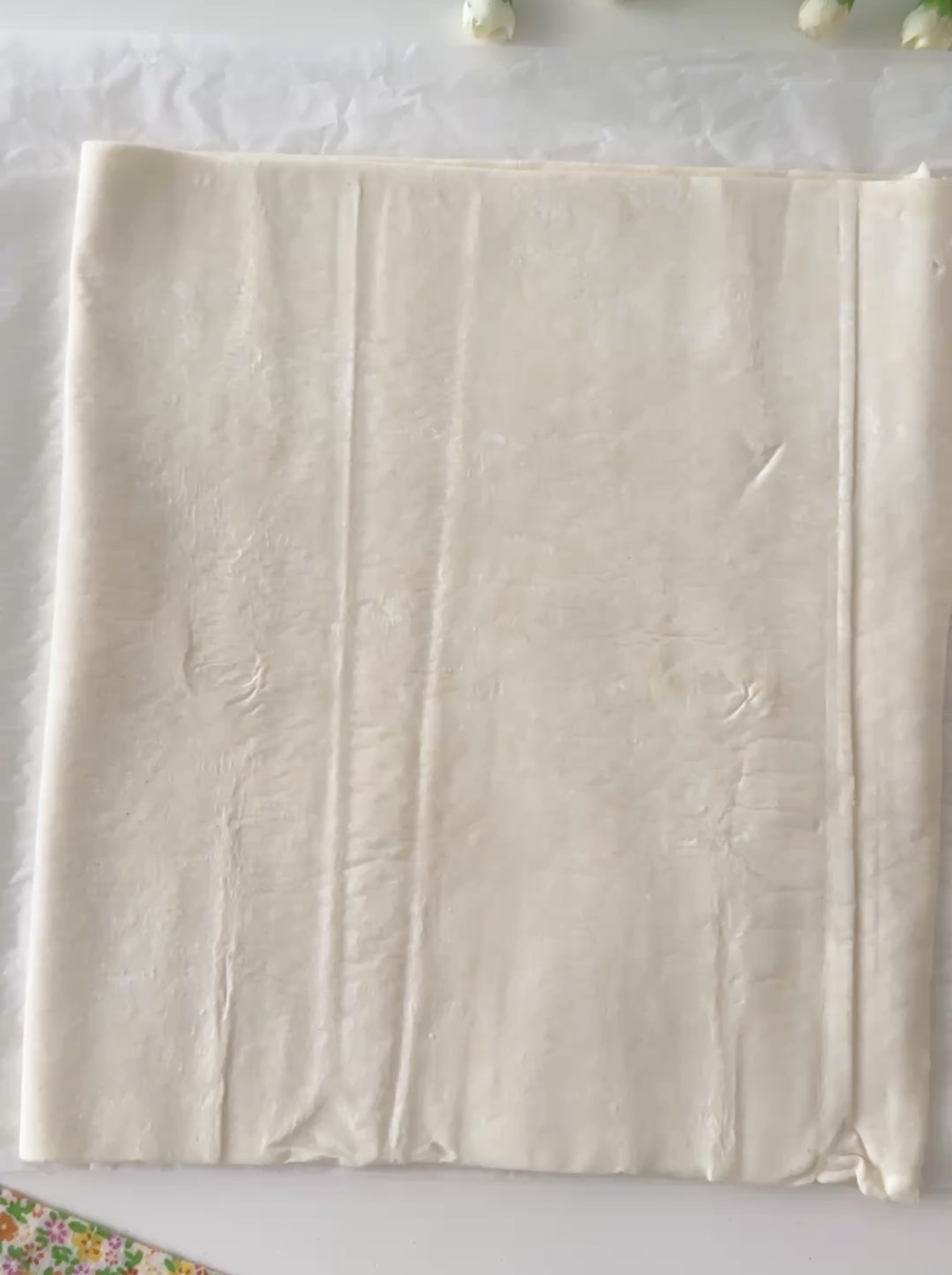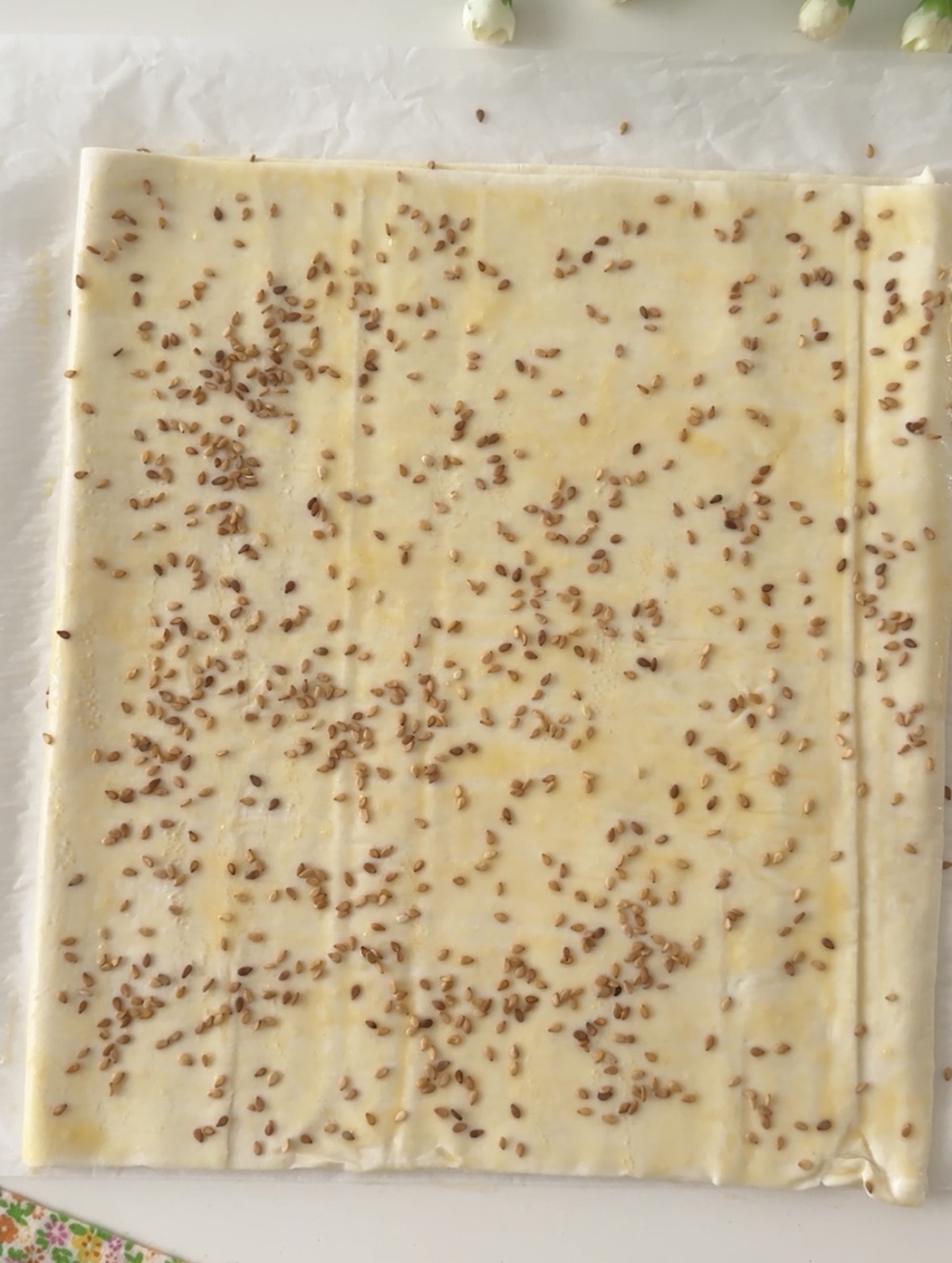 I bocconcini di sfoglia salati sono super facili e velocissimi da preparare, per prima cosa piegate la sfoglia a metà, spennellate la superficie con l’uovo sbattuto e aggiungete dei semini di sesamo.