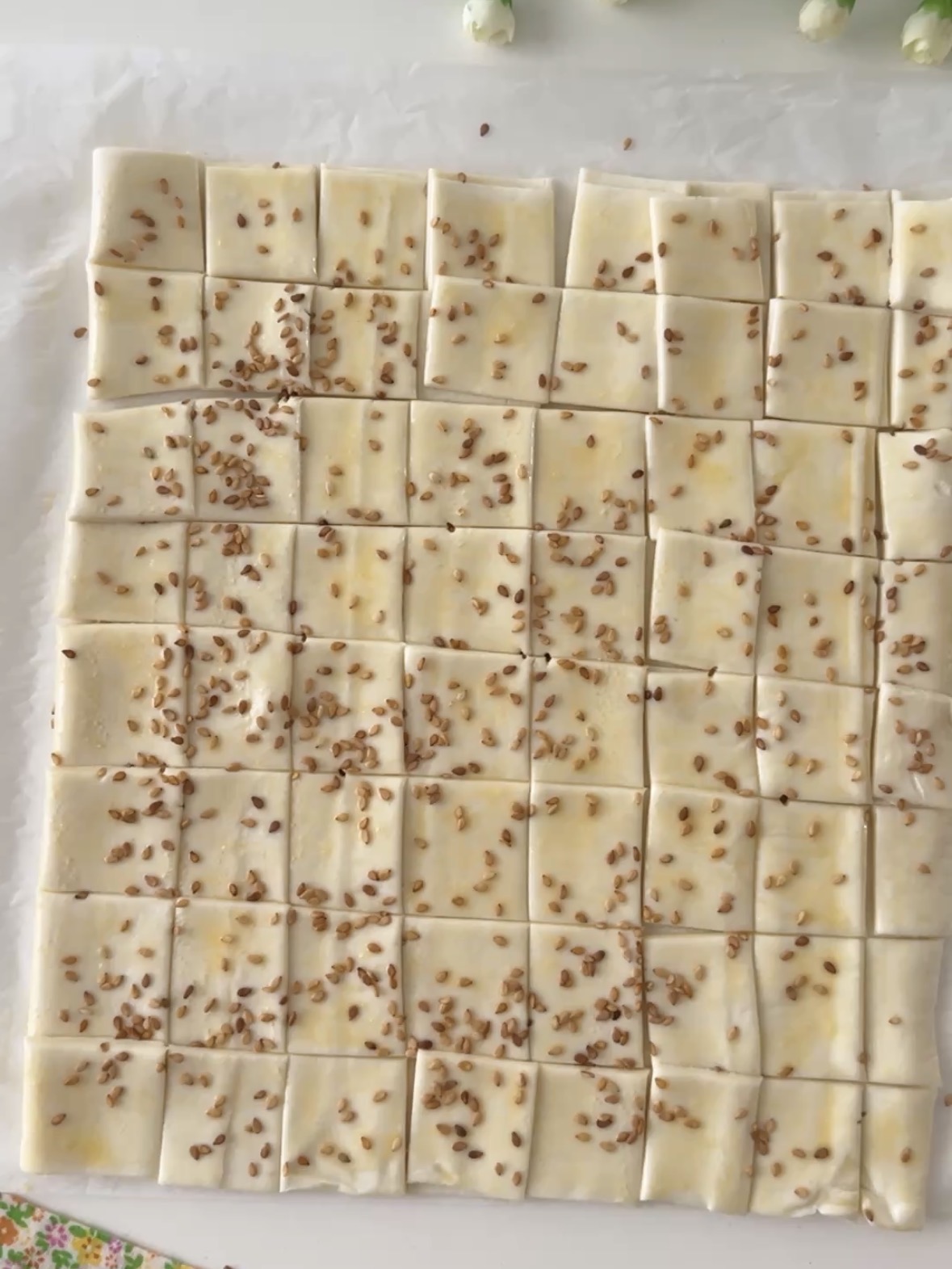 Tagliate la sfoglia a striscioline di circa 2 cm sia in verticale che in orizzontale, otterrete dei quadratini. Io ho tagliato la sfoglia in 8 parti in orizzontale e 8 in verticale, ottenendo, così, 64 pezzi.