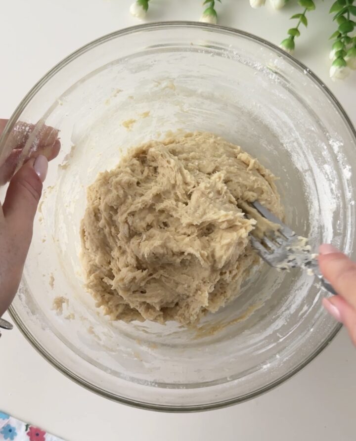 Aggiungete la farina, la scorza grattugiata di limone, il lievito di birra sciolto nel latte tiepido e fate amalgamare tutti gli ingredienti, sempre con la forchetta, non preoccupatevi se l’impasto non risulterà perfettamente omogeneo, deve essere così.
