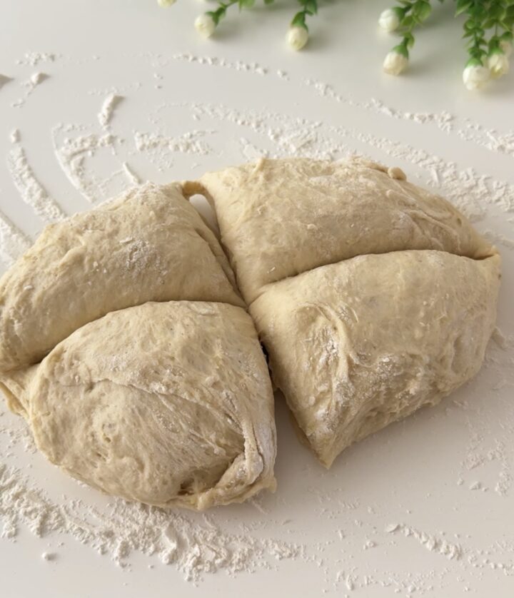 Ripiegate i bordi orizzontali e formate un rotolo, procedete allo stesso modo con gli altri 3 pezzi di impasto.