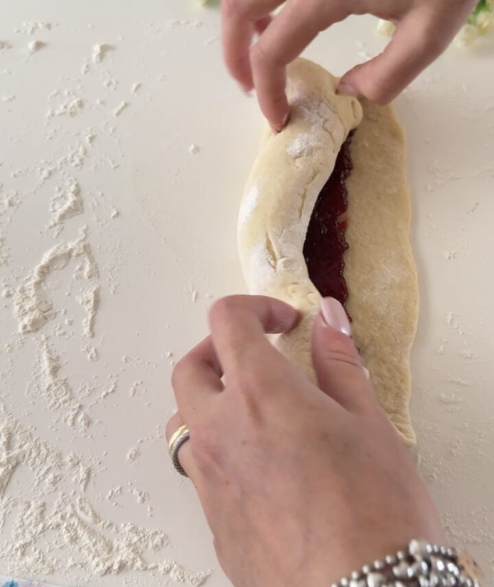 Trascorso il tempo di lievitazione, dividete il panetto in 4 parti uguali. Stendete ogni pezzettino a formare un rettangolo allungato, spesso circa mezzo cm, e spalmate un po’ di marmellata sulla superficie, lasciate un bordo verticale ed i due orizzontali liberi.