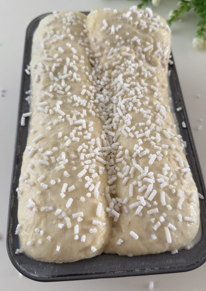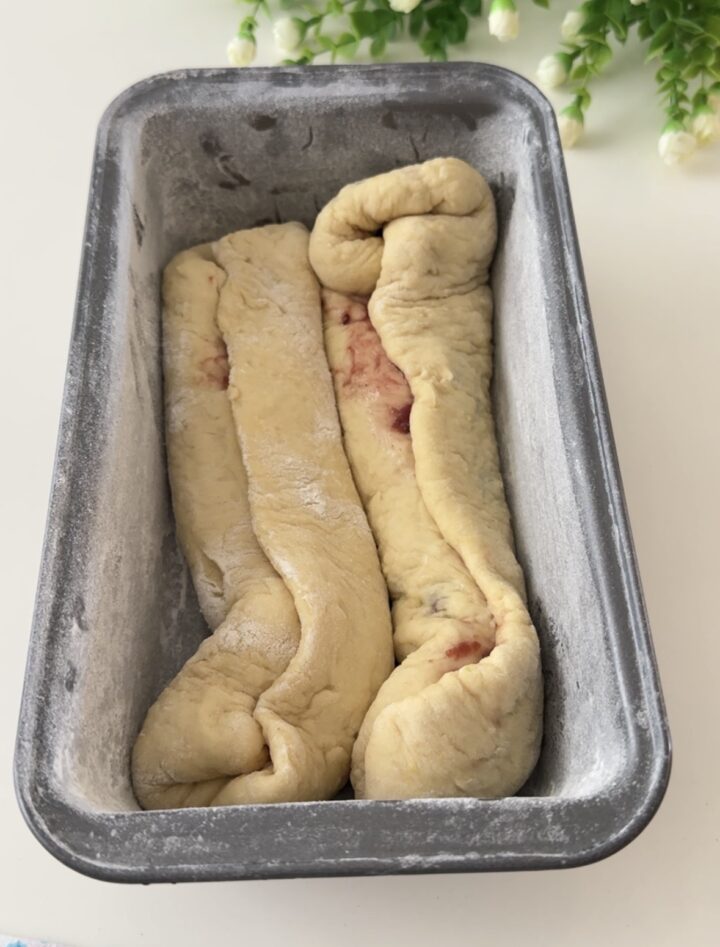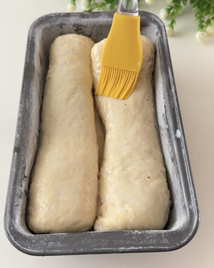 Disponete i 4 rotoli in uno stampo da plumcake imburrato ed infarinato (vi consiglio di sistemare i primi due rivolgendo la parte della chiusura verso l’altro e gli altri due, che stanno sopra, al contrario, ponendo la chiusura al di sotto) e spennellate la superficie con un pochino di latte tiepido.