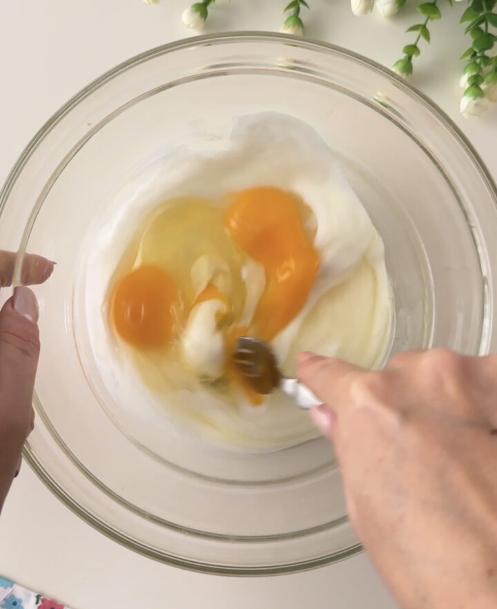 La brioche allo yogurt sofficissima è molto semplice e veloce da preparare, per prima cosa mettete in una ciotola lo yogurt bianco non zuccherato, lo zucchero, le uova, un pizzico di sale e mescolate con una forchetta.